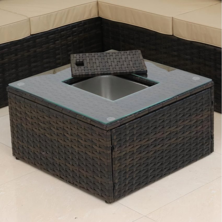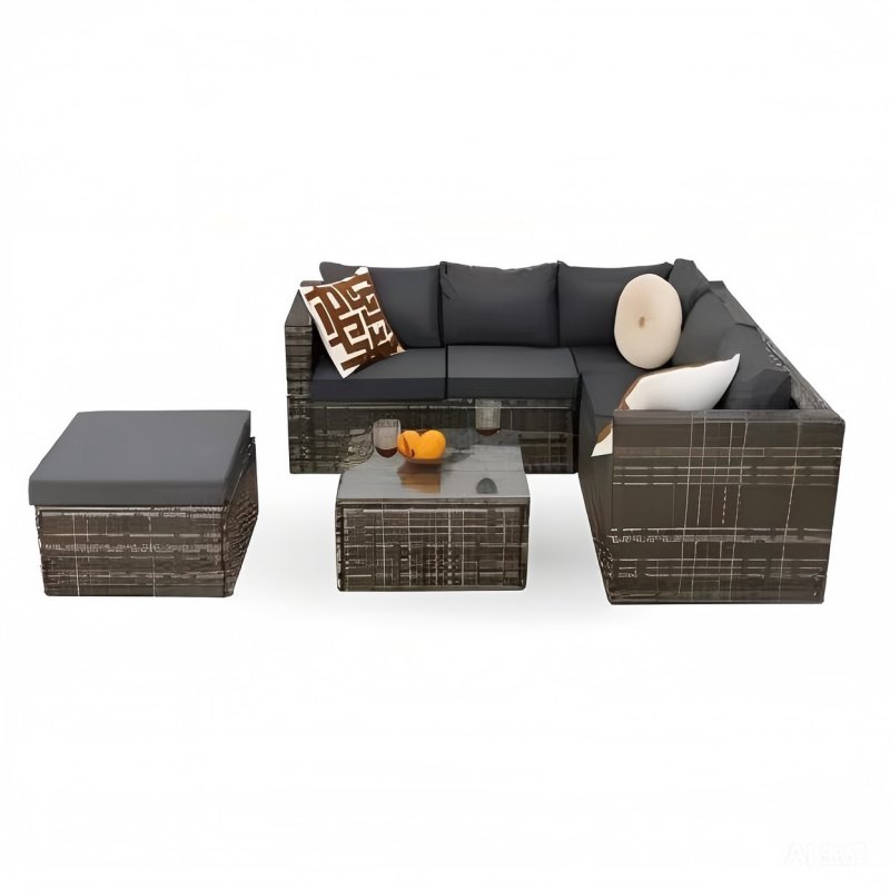 Outdoor wicker(rattan) corner sofa set with cushion, comprising 3-seater, loveseat, coffee table & ottoman, offering a multitude of layout possibilities.