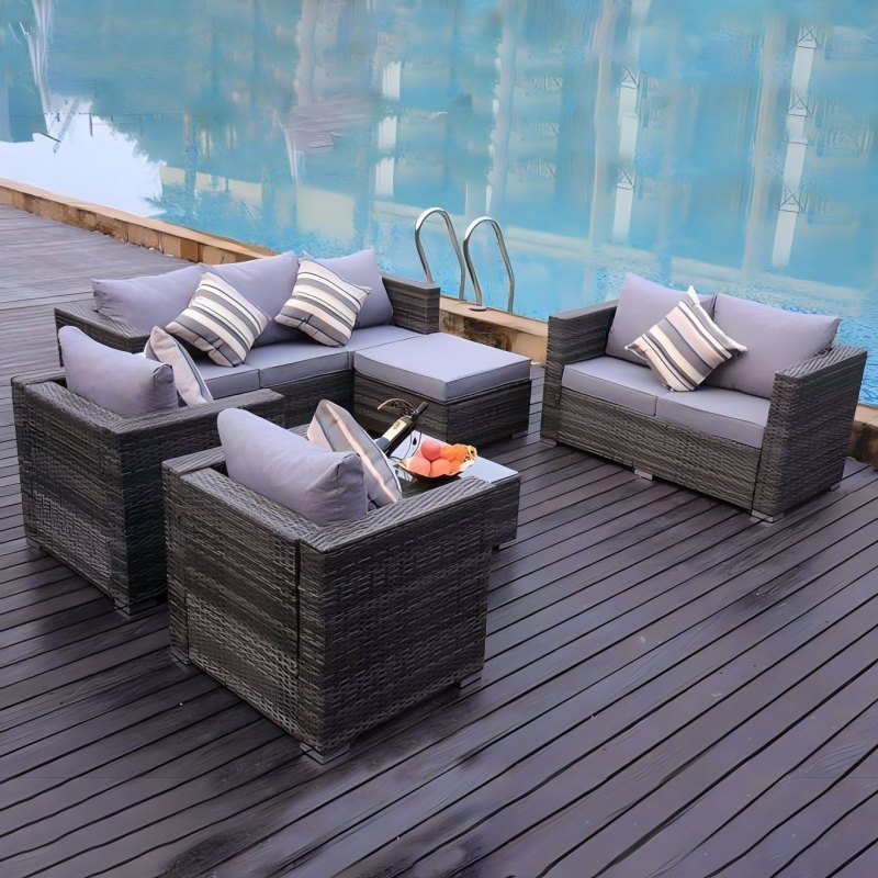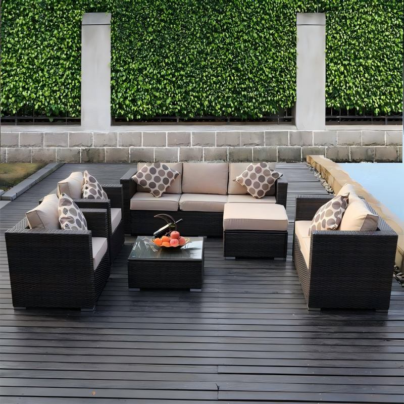 Outdoor wicker(rattan) sofa set with cushion, comprising 3-seater, loveseat, coffee table, ottoman, and armchair, offering a multitude of layout possibilities.