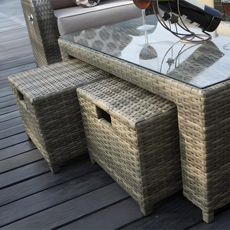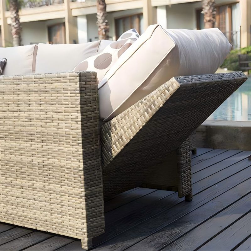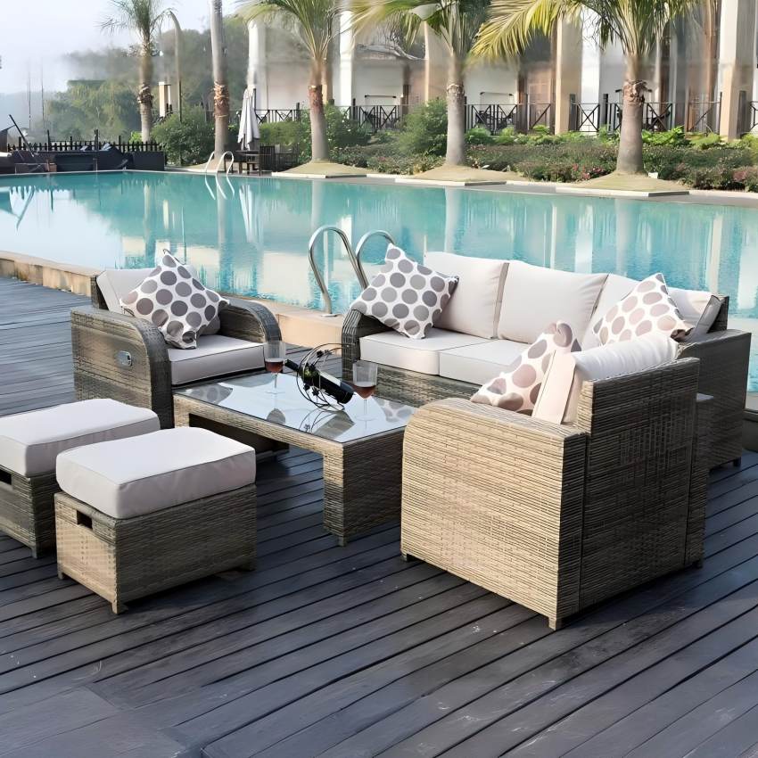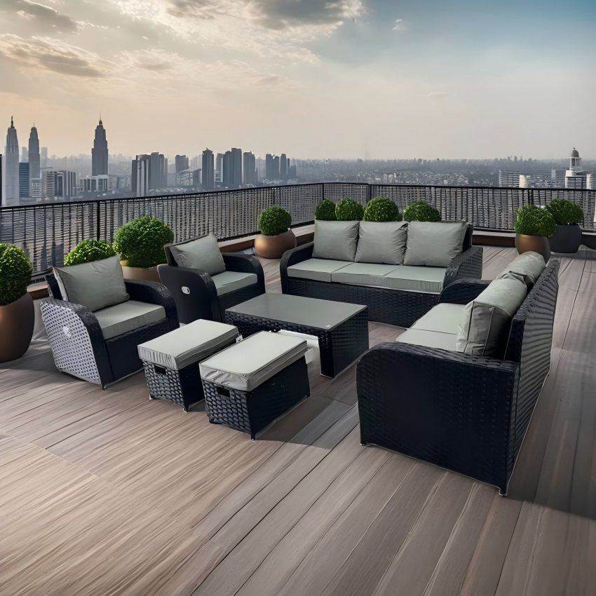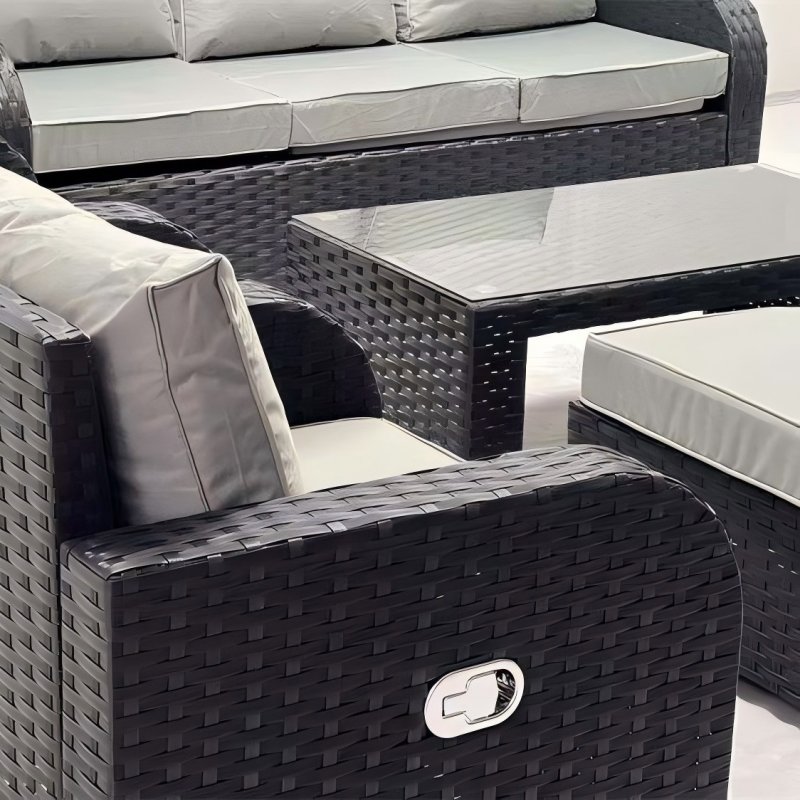 Outdoor wicker(rattan) sofa set with cushion, comprising 3-seater, loveseat, coffee table, ottoman, and reclining armchair, offering a multitude of layout possibilities.