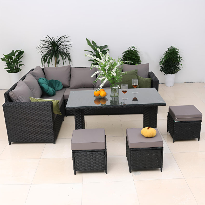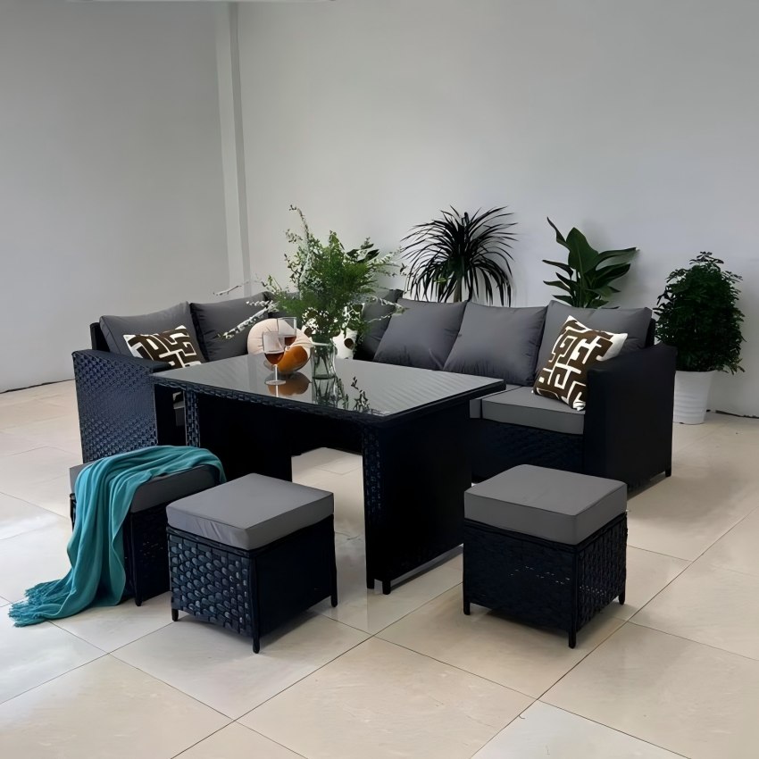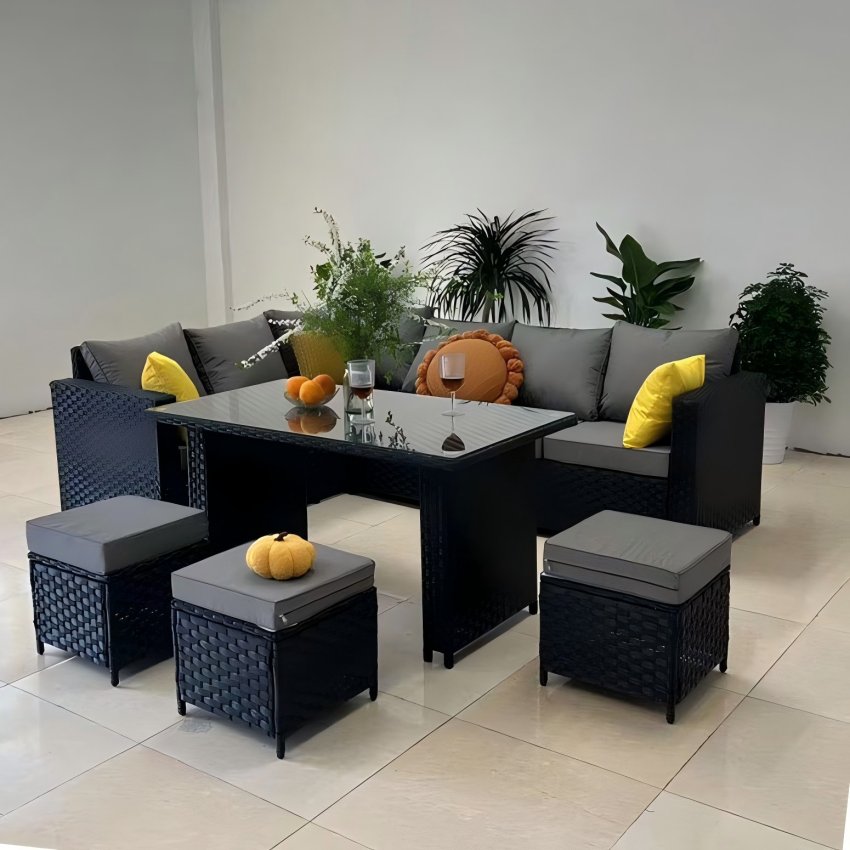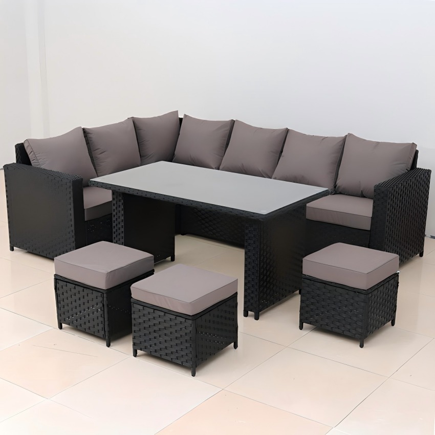Outdoor wicker(rattan) corner sofa set with cushion, comprising 3-seater, table & ottoman, offering a multitude of layout possibilities.