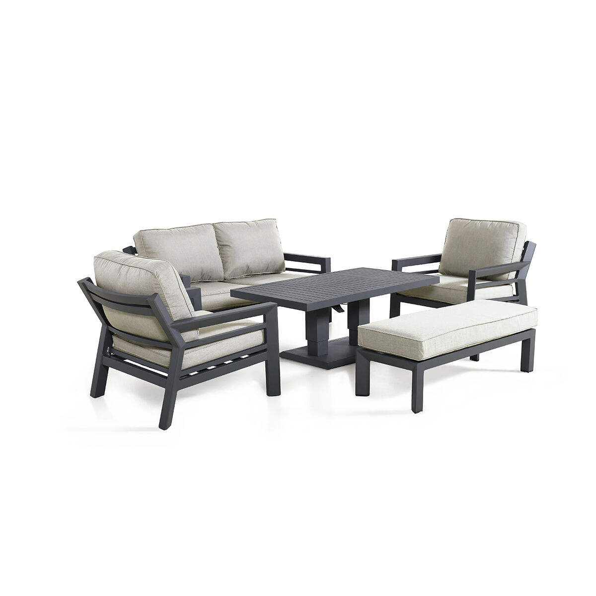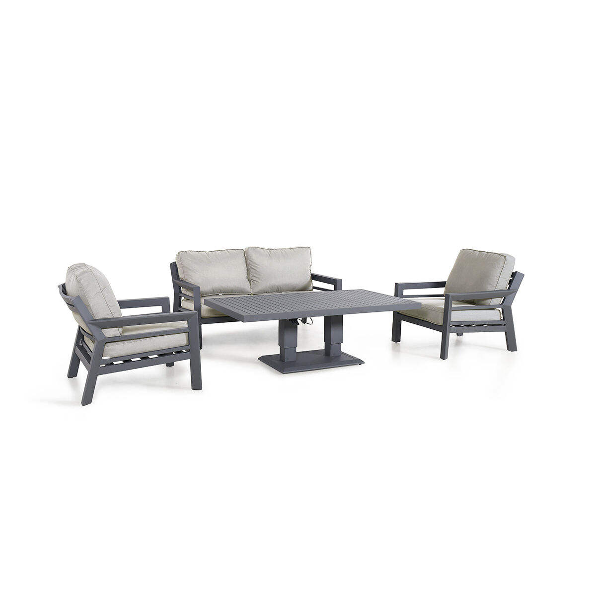 Outdoor Alu slat sofa set with cushion, comprising loveseat, single armchair, adjustable coffee table and ottoman, offering a multitude of layout possibilities.
