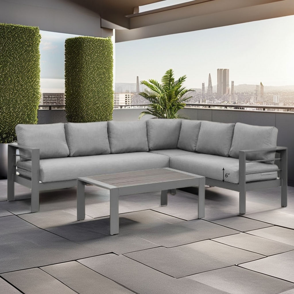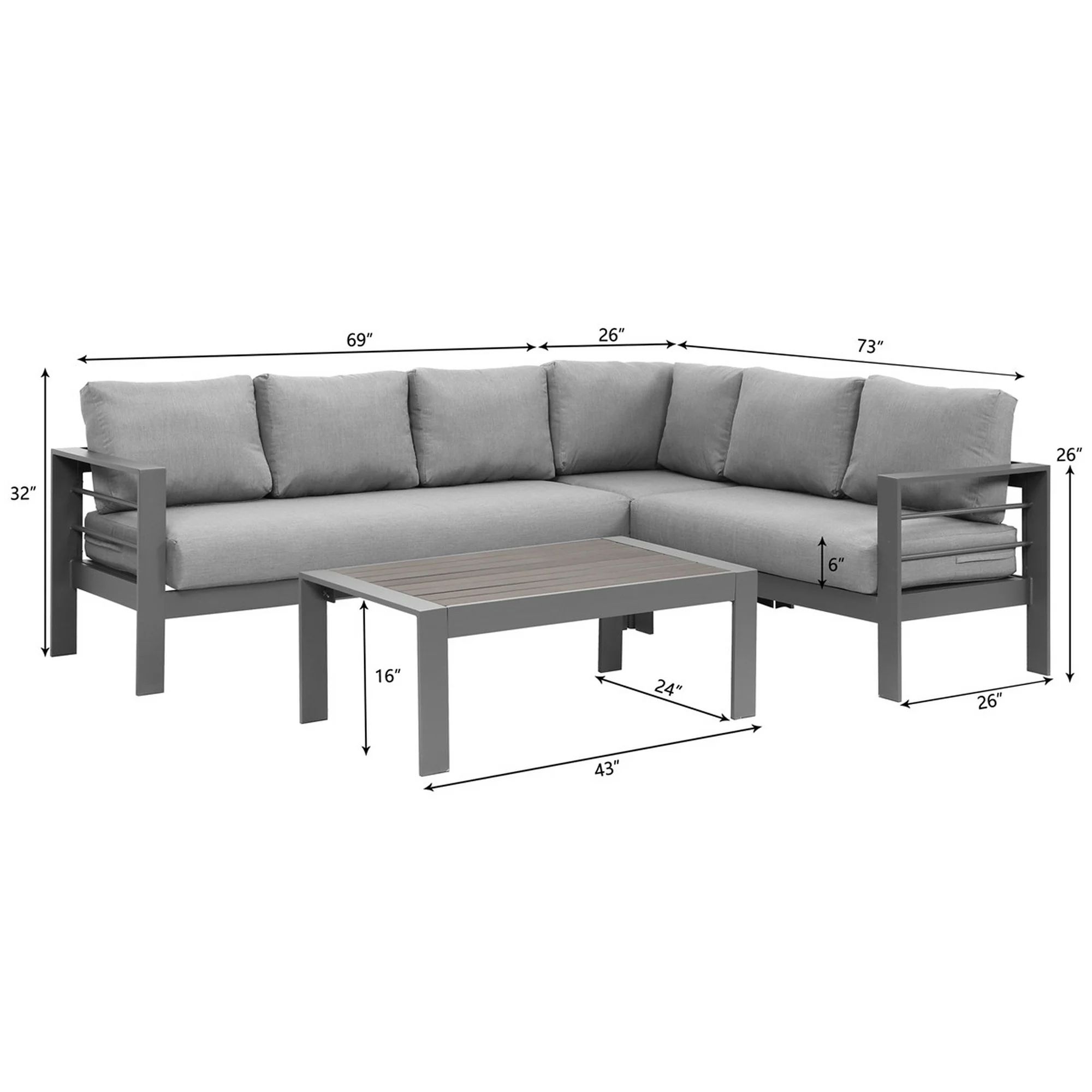 Outdoor Alu slat corner sofa set with cushion, comprising 3-seater sofa, loveseat, corner sofa and coffee table, offering a multitude of layout possibilities.