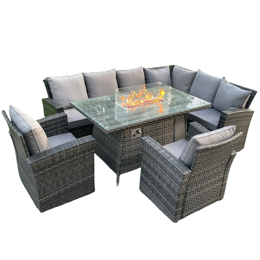 Outdoor wicker(rattan) corner sofa dining set with cushion, comprising 3-seater & single chair, table with or w/o fire pit, offering a multitude of layout possibilities.