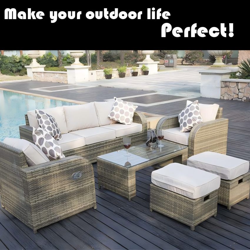 Outdoor wicker(rattan) sofa set with cushion, comprising 3-seater, loveseat, coffee table, ottoman, and reclining armchair, offering a multitude of layout possibilities.